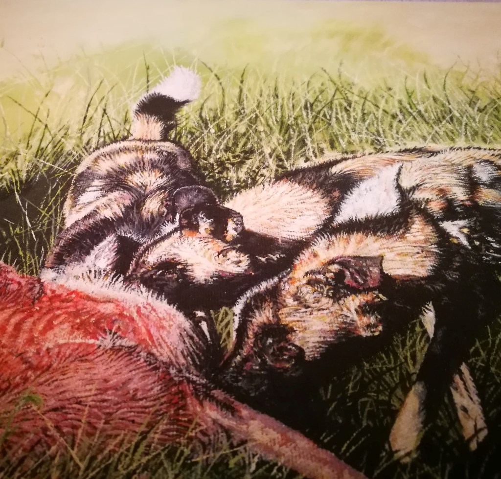 The three I’ve painted here were sisters being temporarily kept at a reserve I visited in South Africa back in 2017 as part of an ongoing metapopulation programme. They were related to all of the remaining males of their original pack and thus in need of a new home and new family in which to breed. Before release, they are first introduced into an enclosure called a boma to allow them and the resident individuals to bond and grow accustomed to one another. Afterwards, they will then quickly dehabituate to their captive lifestyle and resume hunting again.